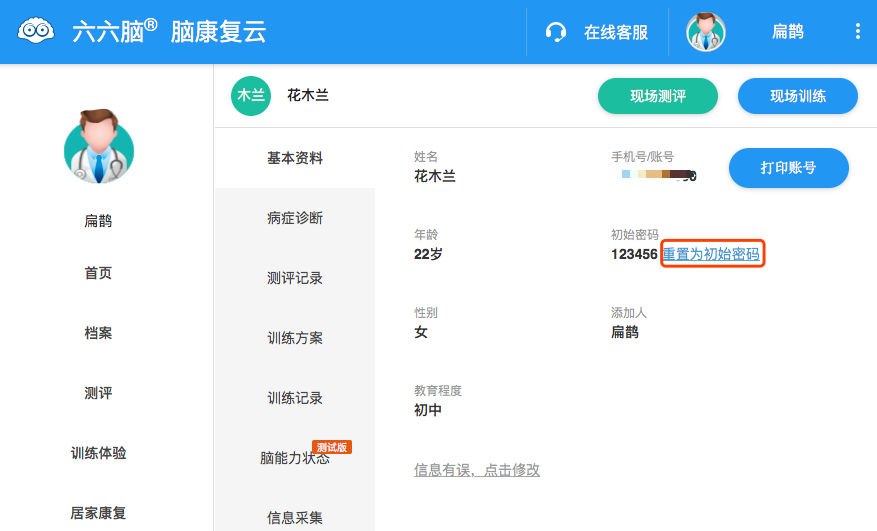- 如果您是患者或者其他脑康复用户:请在登录页下方点击“忘记密码”,通过手机号找回登录密码。或者直接联系您的主治医生,请他为您重置密码为初始密码(在“档案”里点击您的头像,打开您的档案详情页,点击“重置为初始密码”并在弹窗里点击“确认”,这样您就可以用初始密码123456进行登录)。